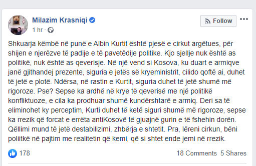 “Shkuarja këmbë në punë e Albin Kurtit është pjesë e cirkut argëtues, për shijen e njerëzve të padije e të pavetëdije politike. Kjo sjellje nuk është as politikë, nuk është as qeverisje. Në një vend si Kosova, ku duart e armiqve janë gjithandej prezente, siguria e jetës së kryeministrit, cilido qoftë ai, duhet të jetë e plotë. Ndërsa, në rastin e Kurtit, siguria duhet të jetë shumë më rigoroze. Pse? Sepse ka ardhë në krye të qeverisë me një politikë konfliktuoze, e cila ka prodhuar shumë kundërshtarë e armiq. Deri sa të eliminohet ky perceptim, Kurti duhet të ketë siguri shumë më rigoroze, sepse ka rrezik që forcat e errëta antiKosovë të gjuajnë gurin e të fshehin dorën. Qëllimi mund të jetë destabilizimi, zhbërja e shtetit. Pra, lëreni cirkun, bëni poliitkë në pajtim me realitetin që kemi, që si shtet ende jemi në rrezik.”