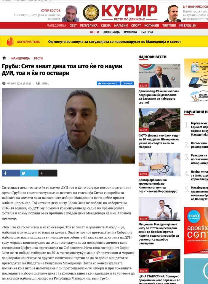 “Fjala popullore “më thuaj me kë rri që të tregoj se çfarë je”, vërtetohet më mirë sot duke parë se në cilat mediume gjen hapësirë Artan Grubi i Bashkimit Demokratik për Integrim për të elaboruar idenë e kryeministrit shqiptar. Po e njëjta parti në vitin 2016 e përdori platformën e partive politike shqiptare për t’i dhënë alibi VMRO-DPMNE-së nacionaliste në atë kohë, dhe në fund e harroj këtë platformë. Ashtu edhe sot Bashkimi Demokratik për Integrim dëshiron ta përdorë idenë e “kryeministrit shqiptar” vetëm për t’i dhënë alibi shtesë përsëri VMRO-DPMNE-së. A nuk është kjo edhe një dëshmi se keto dy parti asnjëherë nuk janë ndarë nga bashkëveprimi dhe atë vetëm për të dëmtuar qytetarët e këtij shteti.” – Përfundoi Memishi.