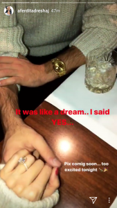Hipëm në ashensor dhe u hap dera, prej daljes nga ashensori deri në tarracë më drejtoi një rrugë e krijuar me petale trëndafili. Kur dola, pashë gjithçka si në filma dhe Kubin që u ul në gjunjë dhe më tha: “Afërdita Dreshaj, gruaja e ëndrrave të mia. A dëshiron ti që ta kalosh pjesën e mbetur të jetës me mua dhe të bëhesh bashkëshortja ime?”