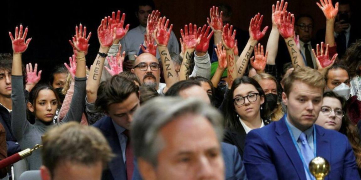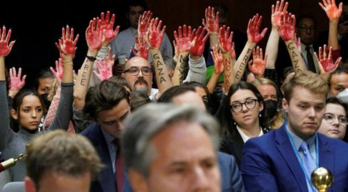 Protestuesit ngritën duart me njolla të kuqe në ajër, në shenjë të masakarve që po bëhen ndaj civilëve në Gaza. Policia e Kapitolit më vonë i largoi ata nga salla e dëgjimit