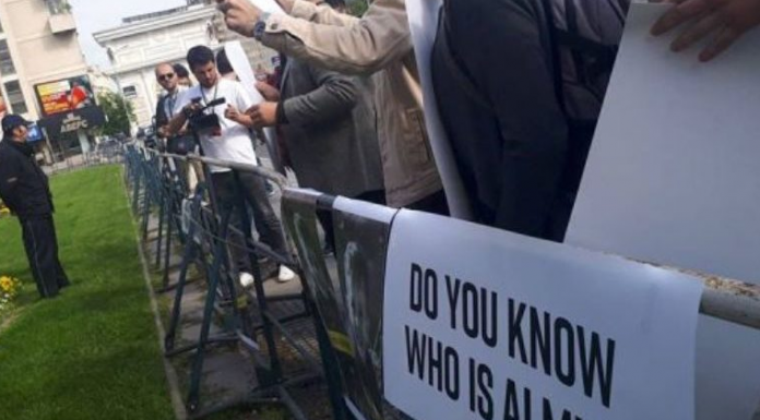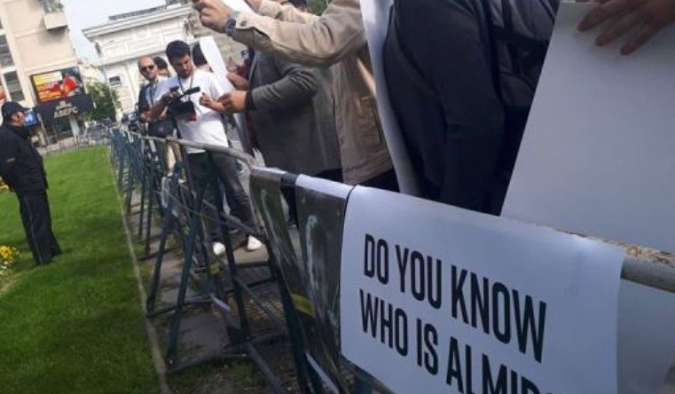 “Do you know who is Almir!? Është njëra prej parullave e vendosur në murin e hekur mbrojtës të vendosur nga organet policore, para ndërtesës së Kuvendit të Maqedonisë, ku qëndron përfaqësuesja e Lartë e BE-së, Federika Mogerini.