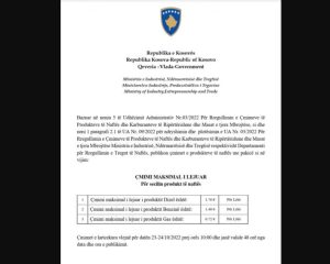 LajmeKosovë Publikohen çmimet, kaq kushton sot nafta dhe benzina 11:31 / 23.10.2022 Një litër naftë sot kushton 1.76 cent. Çmimoren e derivateve për 48 orët e ardhshme e ka publikuar Ministria e Industrisë, Ndërmarrësisë dhe Tregtisë. Teksa benzina kushton 1.40 dhe gasi 0.72. Njoftimi i plotë: