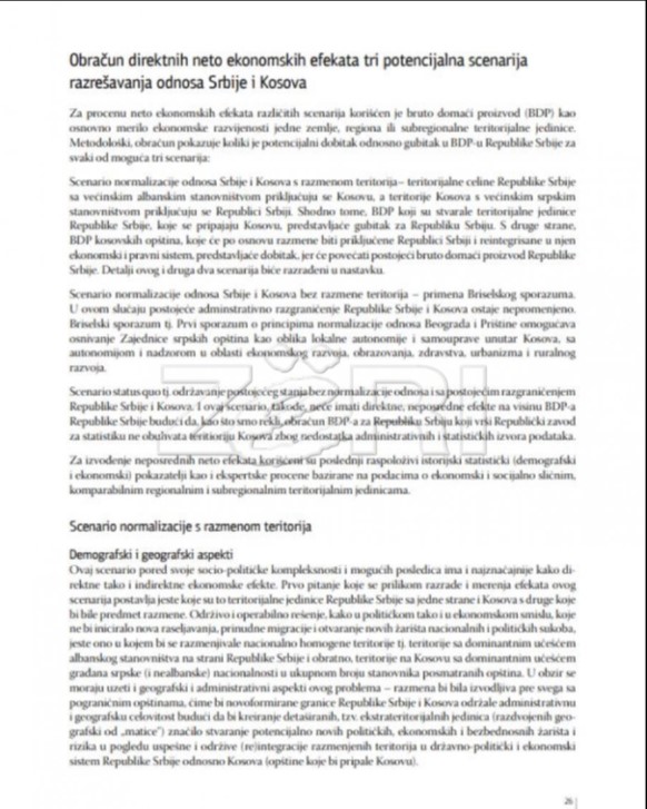 Raporti prej 90 faqesh i përgatitur nga autorët: Miladin Kovaçeviq, Dushan Gavrlioviq, Dragan Popoviq, Milena B. Stevoviq, Liljana Sekuliq dhe Katarina Stançiq, të cilin e posedon “Zëri”, i shtjellon në mënyrë të detajuar dy skenarë për normalizimin e marrëdhënieve: normalizimi i raporteve midis Beogradit dhe Prishtinës, ku përfshihen edhe skenari për shkëmbimin e territoreve, edhe skenari pa shkëmbim të territoreve, por me zbatim të Marrëveshjes së Brukselit të vitit 2013 dhe skenari i Status Quo-s, i cili nënkupton mosnormalizimin e raporteve në mes të dyja vendeve.
