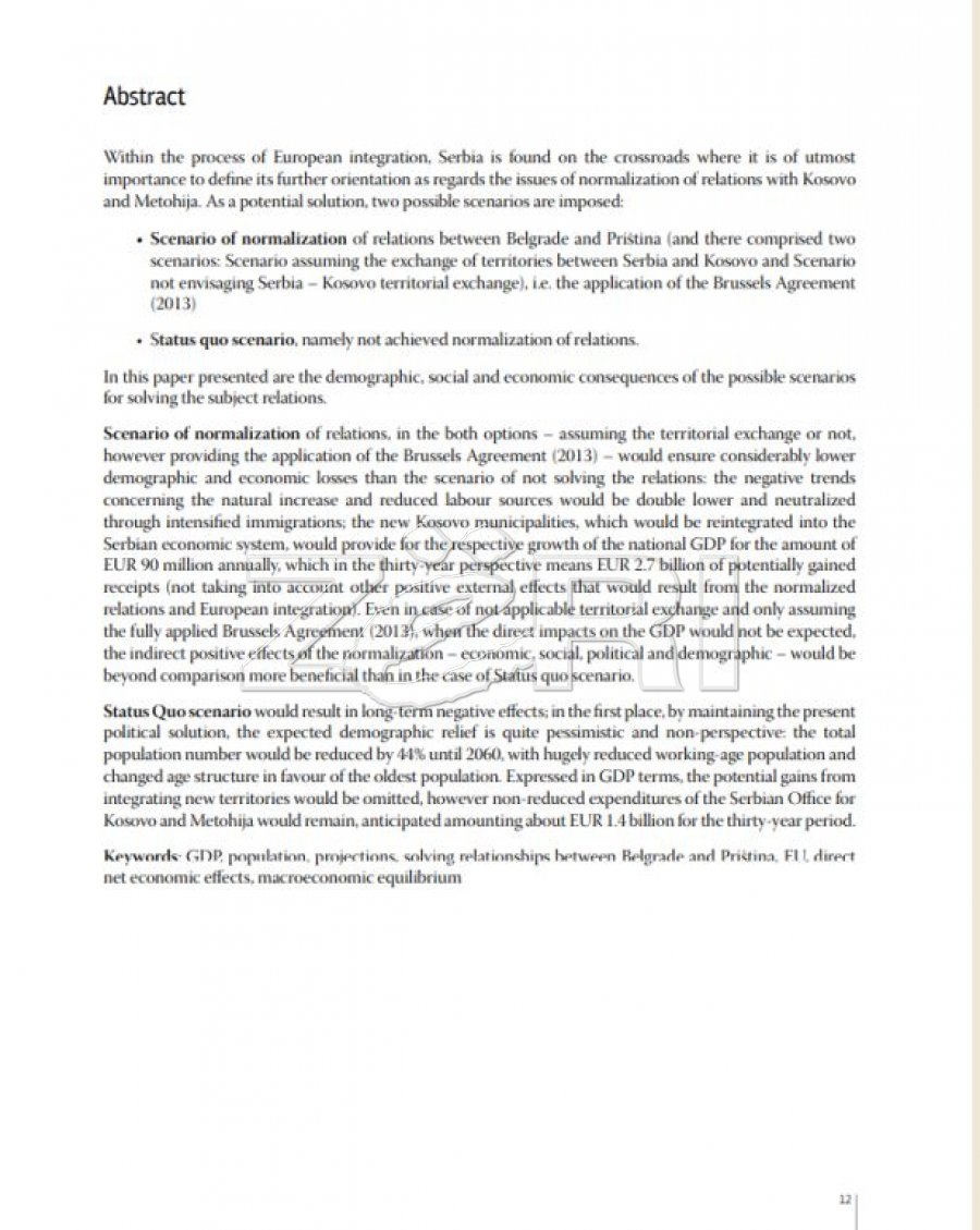 Kështu rekomandojnë gjashtë ekspertë serbë nëpërmjet një raporti me titull: “Efektet ekonomike, demografike e sociale dhe skenarët e ndryshëm për normalizimin e raporteve midis Beogradit dhe Prishtinës”, i botuar në prill të vitit 2018 dhe i përkrahur nga Fondacioni për Shoqëri të Hapur në Beograd, të cilin ka arritur ta sigurojë gazeta “Zëri”.