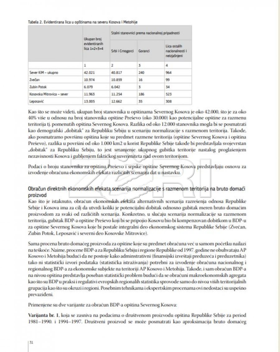 Ky raport në mënyrë të detajuar flet për efektet ekonomike, demografike e sociale dhe për ide të ndryshme për normalizimin e raporteve në mes të dyja vendeve. Propozohet që Kosova ta marrë vetëm Preshevën, ndërsa Serbia katër komunat veriore të vendit, me ç’rast përmenden përfitimet nga ky skenar prej 2.7 miliardë eurosh për shtetin fqinj.