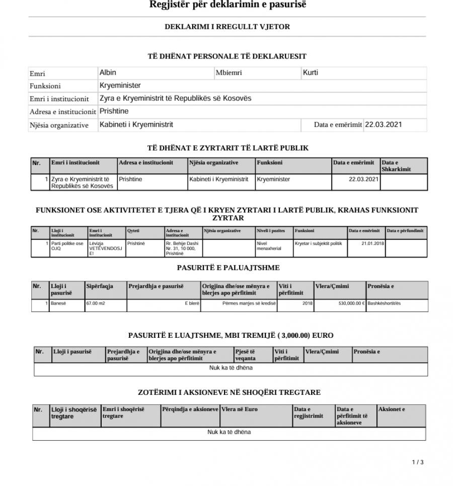 Agjencia për Parandalimin e Korrupsionit ka publikuar deklarimin vjetor të pasurisë së kryeministrit të Kosovës, Albin Kurti, ku vërehen disa ndryshime në krahasim me vitin e kaluar, kryesisht te kursimet dhe shpenzimet për qira.