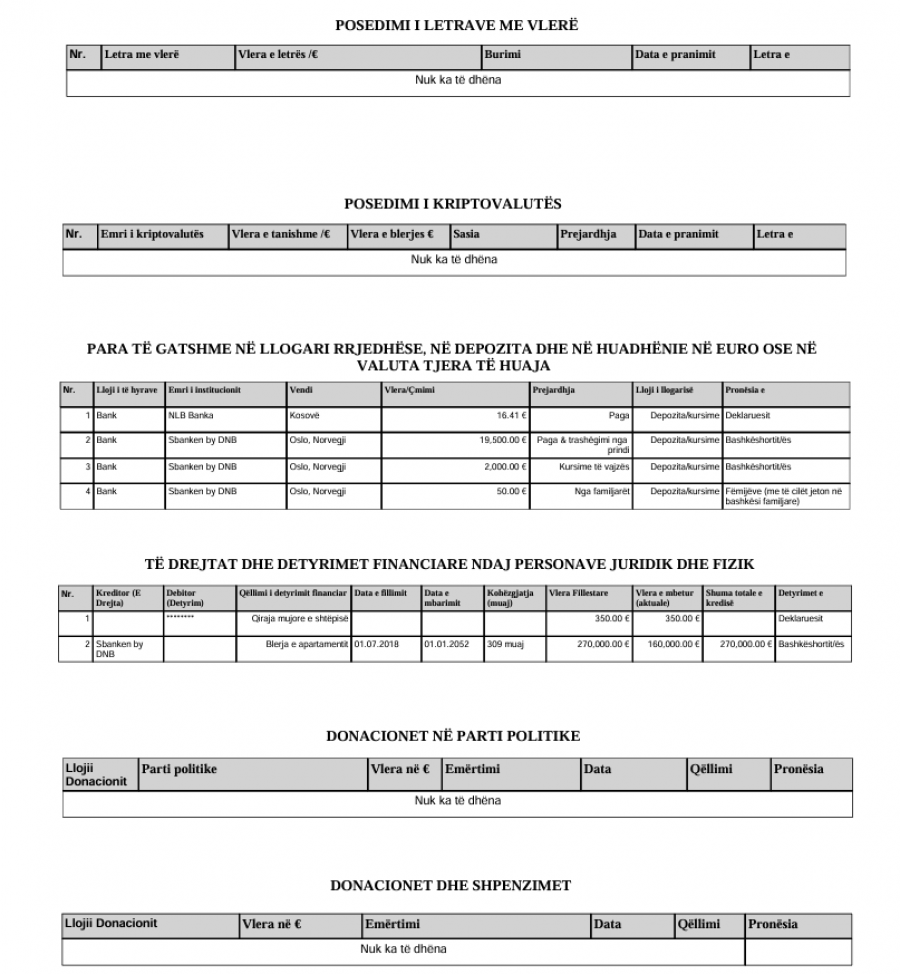 Ndërkohë, te detyrimet financiare figuron kredia e bashkëshortes, me vlerë të mbetur prej 160 mijë eurosh.
