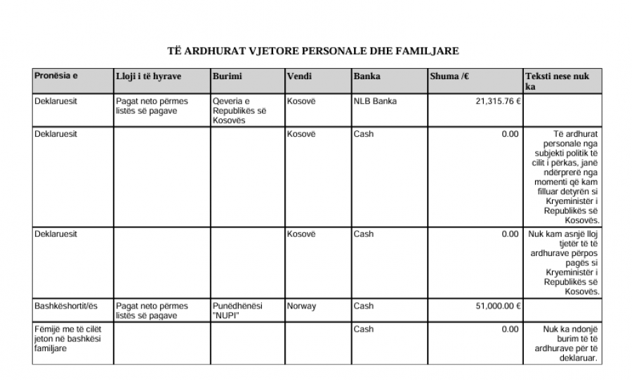 Po ashtu, janë deklaruar edhe 2 mijë euro kursime në emër të vajzës, si dhe 50 euro të tjera, të cilat sipas deklarimit kanë prejardhje nga familjarët.