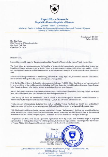 Ministrja e Punëve të Jashtme të Kosovës, Meliza Haradinaj-Stublla, përmes një letre i është drejtuar drejtorit ekzekutiv të Apple, Tim Cook, duke kërkuar edhe zyrtarisht nga ai, përfshirjen e Kosovës në hartën e Apple.