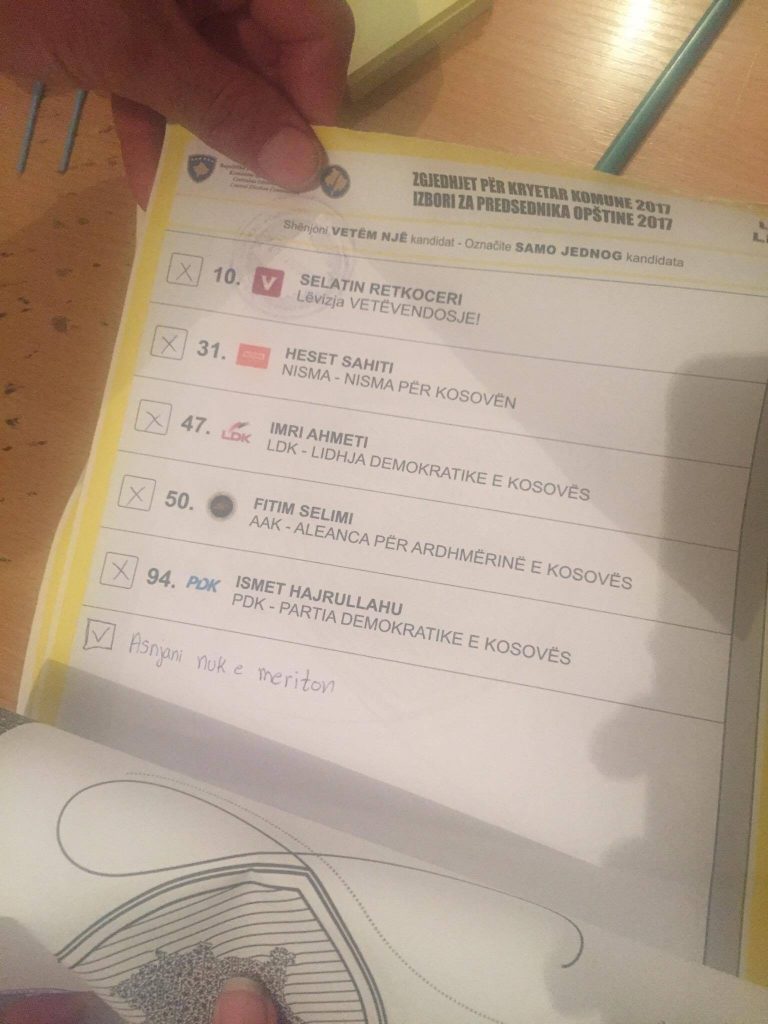Njëri prej tyre, pasi ka vendosur “X” në katrorët e pesë kandidatëve për kryetar të Komunës së Lipjanit, e ka bërë edhe një katror tjetër dhe në vend të emrit të kandidatit dhe subjektit politik e ka shkruar: “Asnjera nuk e meriton”.