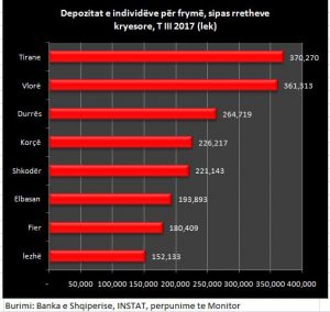 Qyteti që kryeson është Tirana. Individët në kryeqytet kanë gjithsej në banka në lekë e valutë rreth 319 miliardë lekë, sipas të dhënave të Bankës së Shqipërisë, ose 67% të totalit të depozitave që ka Tirana (pjesa tjetër zotërohet nga bizneset e institucionet). Me një popullsi prej 862 mijë banorësh, sipas INSTAT, çdo banor i Tiranës ka një kursim në bankë prej 370 mijë lekësh. Tirana është edhe qyteti që ka nivelin më të lartë të të ardhurave për frymë në vend, sipas INSTAT, me 679 mijë lekë në vit, duke qenë në linjë të drejtë me vendin e parë që zë për sa u përket kursimeve për frymë.