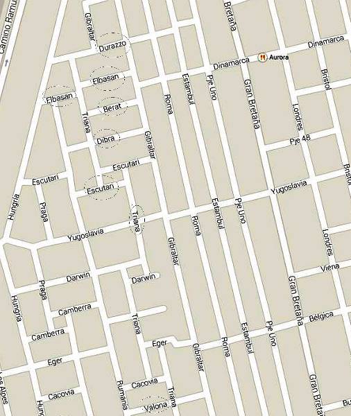 Elbasan”, ”Rruga Shkodra”, “Rruga Tirana”, (Google diku e jepte gabim “Triana” por në vazhdim po të ndiqet rruga, më poshtë në hartë del e qartë, “Tirana”)”, “Rruga Vlora”, (Valona)”…