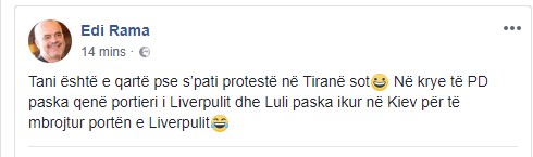 “Tani është e qartë pse s’pati protestë në Tiranë sot Në krye të PD paska qenë portieri i Liverpulit dhe Luli paska ikur në Kiev për të mbrojtur portën e Liverpulit”, ka qenë ky reagim i shkurtër i Ramës në Facebook.