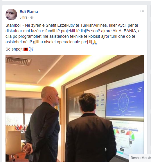 “Në zyrën e Shefit Ekzekutiv të TurkishAirlines, Ilker Ayci, për të diskutuar mbi fazën e fundit të projektit të linjës sonë ajrore Air Albania, e cila po programohet me asistencën teknike të kolosit ajror turk dhe do të asistohet në të gjitha nivelet operacionale prej tij”, shkruan Rama në Facebook.