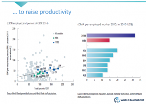 Produktivitetin më të lartë e ka Kosova, me gati 18 mijë dollarë, e ndjekur nga Mali i Zi, Bosnja, Serbia, Maqedonia dhe vetëm në fund vjen Shqipëria. Një sfidë për rajonin, thotë raporti, është që produktiviteti mesatar i punës është më pak se gjysma e niveleve të 7 vendeve të tjera të vogla në tranzicion, që janë tashmë në BE (Bullgaria, Kroacia, Estonia, Letonia, Lituania, Republika Sllovake dhe Sllovenia). Për këto vende, sipas grafikut, VBSH është mbi 30 mijë dollarë.