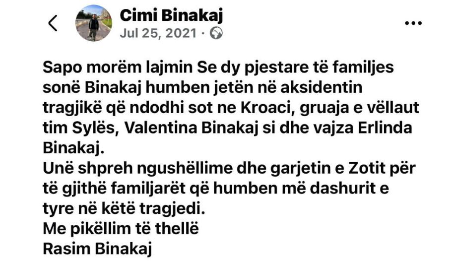 I ndjeri më parë kishte shkruar për aksidentin e rëndë në Kroaci, ku kishin humbur jetën nëna dhe motra e Elijonës.