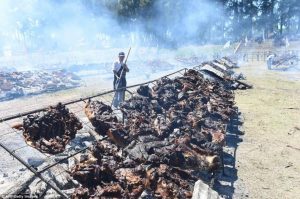 Pamjet e habitshme nga vendi i Amerikës së Jugut tregojnë se kuzhinierët përgatisin sasi të mëdha të mishit, ndërsa tymi ka mbushur ajrin.