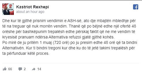 LajmeMaqedoni Rexhepi: Jemi të gatshëm, tregoni kur dhe ku do të jetë takimi trepalësh?! 15:46 / 04.02.2020 Nënkryetari i Lëvizjes Besa, Kastriot Rexhepi ka komentuar “ultimatumin” 48 orësh të ASH-së për koalicionim trepalësh. Rexehpi thotë se kemi pritur 1 muaj (720 orë) do presim edhe 48. Më tej Rexhepi thotë se janë të gatshëm për koalicion trepalësh.