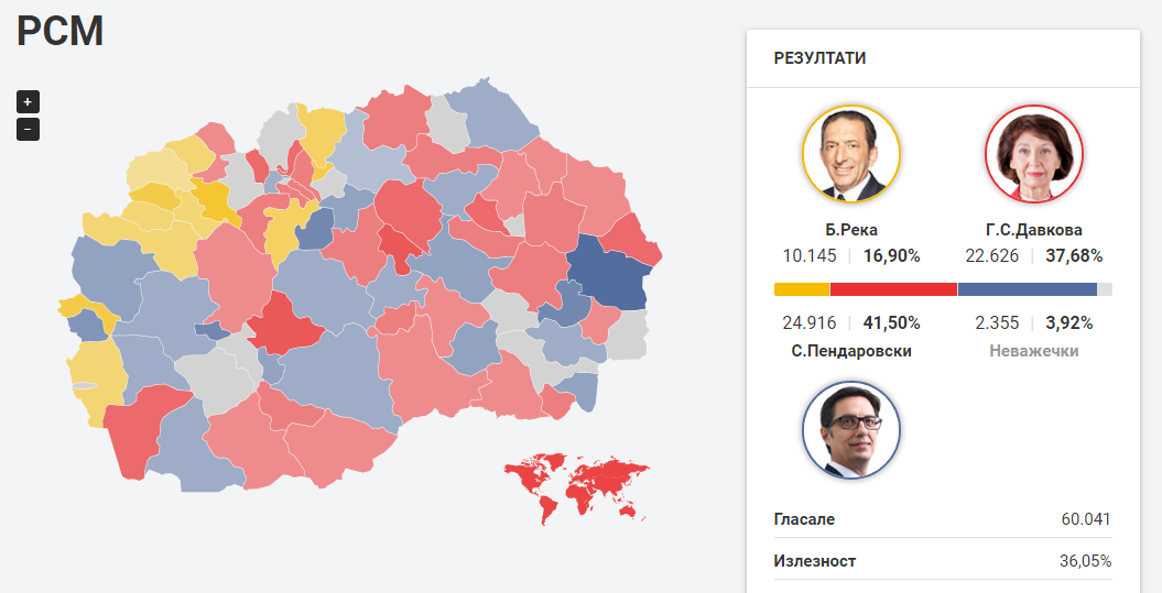 Sipas rezultateve më të fundit të ripërpunuara nga webfaqja e KSHZ-së kryeson Stevo Pendarovski me 24 mije vota,