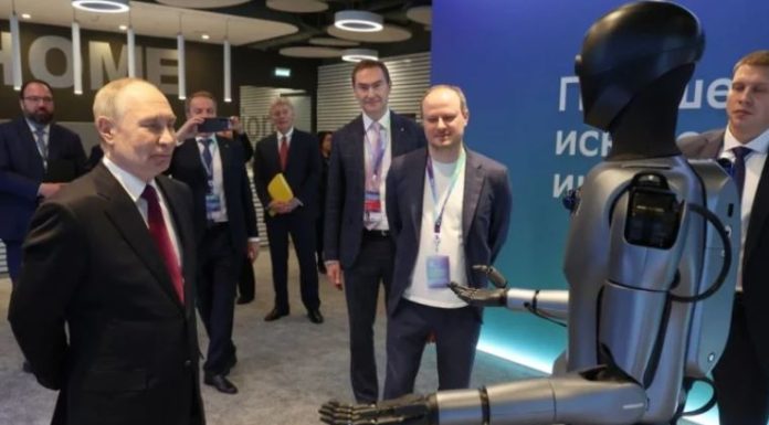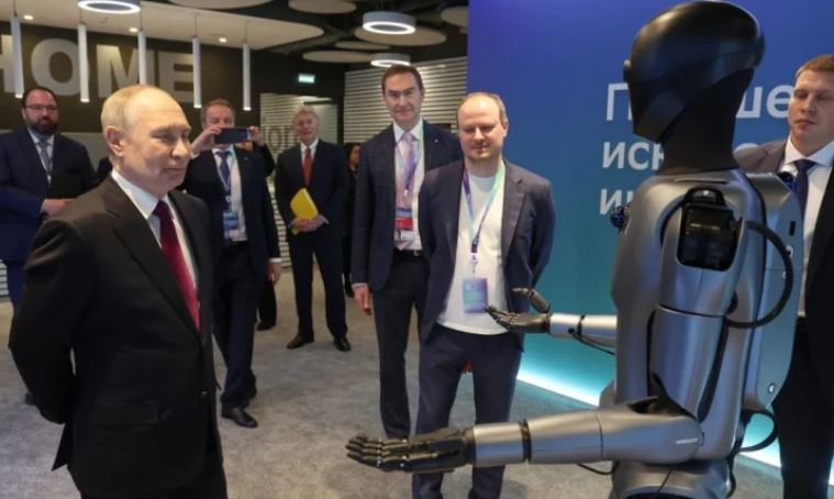 Një robot humanoid me inteligjencë artificiale zhvilloi shfaqje përballë Vladimir Putinit në një ekspozitë të organizuar nga Sberbank, banka më e madhe e Rusisë.