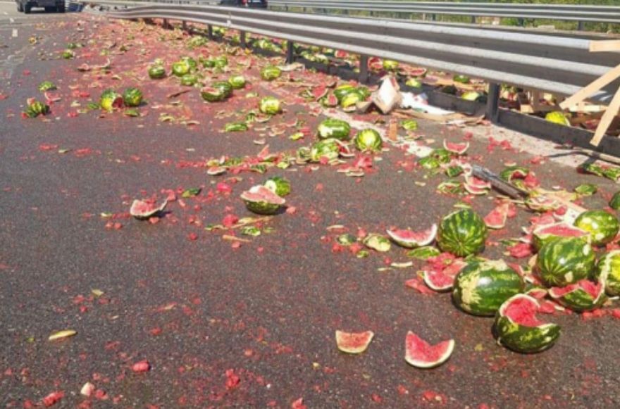 Pamje të trishta janë bërë publike në rrjete sociale. Një aksident në rrugën e Kombit ka bërë që një sasi e madh e shalqirit të përfundojë në autostradë.