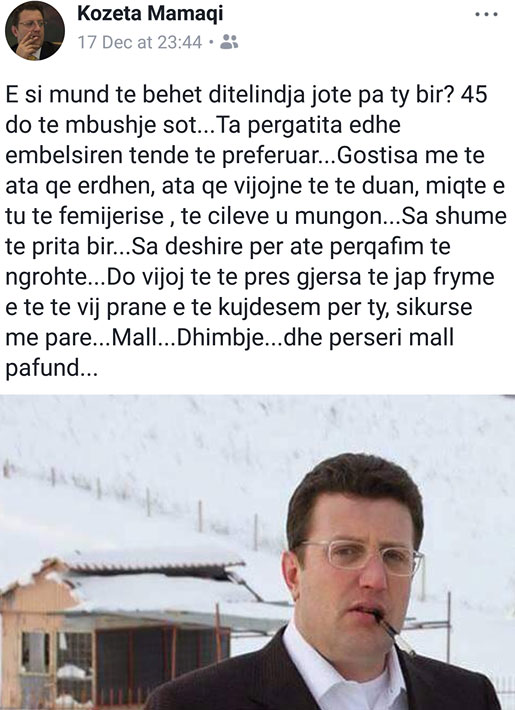 Nëna e ish ministrit të ndjerë Sokol Olldashit Kozeta Mamaqi, ka kujtuar me një mesazh prekës ditëlindjen e 45-të të djalit të saj.