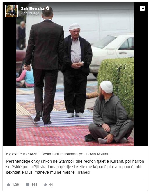 “Ky eshte mesazhi i besimtarit musliman per Edvin Mafine: Shkon në Stamboll dhe reciton fjalët e Kuranit, por harron se është po i njëjti sharlantan që dje shkelte me këpucë plot arrogancë mbi sexhdet e Muslimanëve mu në mes të Tiranës!”, thekson Berisha në mesazhin e tij.