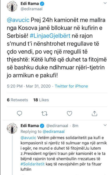 “Ju lutem z.President ngrijeni traun për kamionët e le ta bëjmë rajonin tonë shembullin rrezatues të solidaritetit kaq të nevojshëm për ta fituar luftën“, thotë kreu i qeverisë shqiptare.