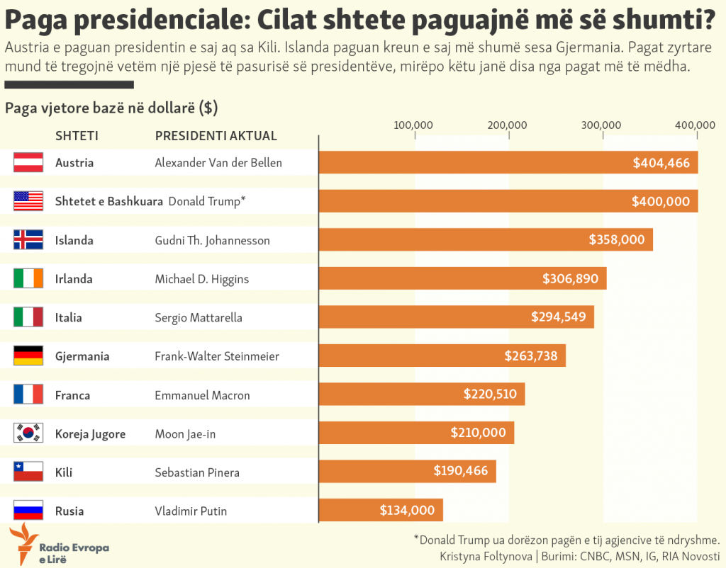Kështu, sipas grafikut më poshtë, Austria është shteti që e paguan më shumë Presidentin e vendit, me një pagë vjetore prej 404466 dollarë.