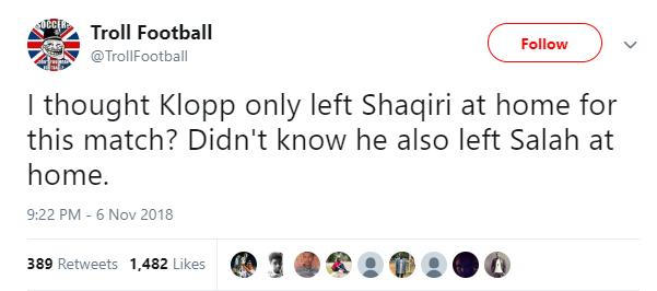 “Mendova se Klopp e la vetëm Shaqirin në shtëpi për këtë lojë? Nuk e kam ditur se e ka lënë edhe Salahin në shtëpi”, shkruan kjo faqe.