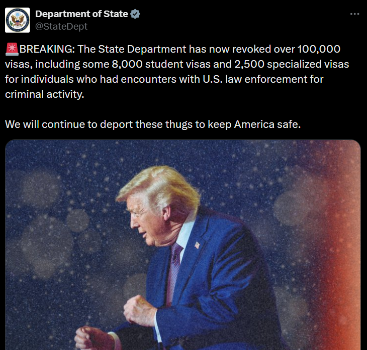 Departamenti Amerikan i Shtetit ka njoftuar se ka revokuar mbi 100 mijë viza, si pjesë e masave për forcimin e sigurisë kombëtare. Lajmi është bërë i ditur përmes një postimi në rrjetin social “X”.