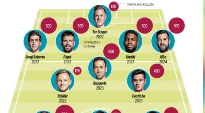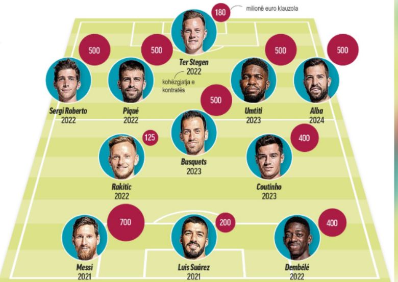 Barcelona ka tashmë një grup lojtarësh të formacionit bazë, që vërtiten te klauzola e 400-500 milionëve: Pique, Busquets, Sergi Roberto, Umtiti dhe së fundi Jordi Alba. Shuma e klauzolave të formacionit katalanas arrin në 4.505 milionë euro. Në njëmbëdhjetëshen e parë, Ivan Rakitic ka klauzolën më të ulët, 125 milionë euro.
