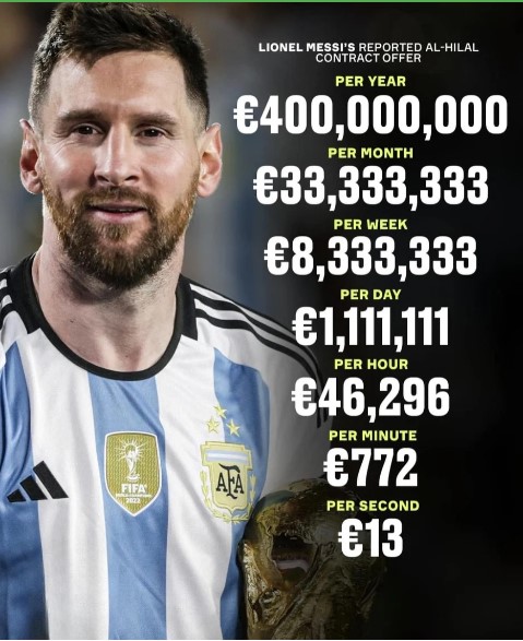 Kështu, nëse Messi bie dakord, në Arabinë Saudite ai do të fitonte 13 euro çdo sekondë, dhe 772 euro çdo minutë. Kjo do të thotë se paga për orë për argjentinasin e famshëm do të ishte 46,300 euro.