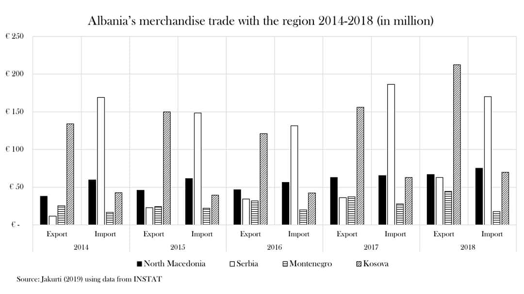 Në bazë të të dhënave të Institutit të Statistikave të Shqipërisë (INSTAT), gjatë periudhës 2014-2018, nga vendet në rajon, Shqipëria më së shumti ka importuar mallra nga Serbia (e më së paku nga Mali i Zi) dhe më së shumti ka eksportuar në Kosovë (e më së paku në Serbi). Nga viti në vit, surplus tregtar ka patur vetëm me Kosovën dhe Malin e Zi, ndërsa deficit të thellë tregtar me Serbinë, e më të vogël me Maqedoninë e Veriut.