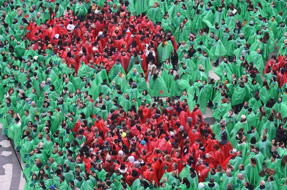 Pjesëmarrësit vendosën qese plastike në ngjyrë të gjelbër dhe të kuqe, qëndruan në vijat e shënuara paraprakisht me qëllim që të krijonin formën e pemës së Vitit të Ri.