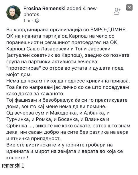 “Në kordinim të organizuar me VMRO-DPMNE-në, Komiteti Komunal nga partia e tyre në Karposh në krye me kryetarin e këtij komiteti Sasho Llazarevski dhe Toni Jarevski këshilltar aktual në Karposh , së bashkull me aktivistë partiak sonte protestuan para shtëpisë time, shkruan deputetja e LSDM-së Frosina Remenski.