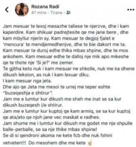 Jam shumë më e lumtur kur dikush më godet me një shpullë ballë-për-ballë, sesa një thikë pas shpine. Se di si qëndroni akoma në këtë Facebook dhe nuk fshini vetveten! Do mësohem dhe me këtë!”- përfundon Rozi.
