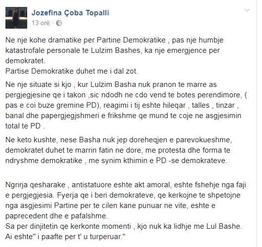 Pas humbjes së thellë që PD pësoi më 25 qershor përballë PS ku doli me vetëm 43 mandate, shumë demokratë të acaruar dhe të mërzitur me rezultatin kërkuan largimin e Bashës nga kreu i PD-së.