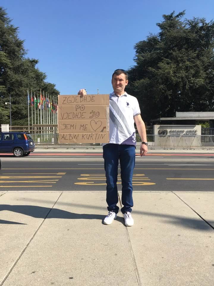 Amir Demiri nga Kumanova, i cili jeton në Gjenevë të Zvicrrës ka gjetur kohë që shkruaj një pankartë në mbështetje të Albin Kurtit.
