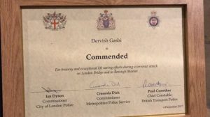Në lëvdatën e policive në Britani të Madhe për Gashin theksohet se ai nderohet “për trimërinë dhe përpjekjet e jashtëzakonshme për të shpëtuar jetët gjatë një sulmi terrorist në London Bridge dhe në Borough Market”./koha