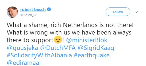Ish-ambasadori i OSBE-së në Tiranë, Robert Bosch ka reaguar pas shpalljes së shteteve që ndihmuan Shqipërinë në fatkeqësinë e 26 nëntorit. Mes listës së shteteve nuk ishte Holanda dhe Bosch këtë e konsideroi një turp.