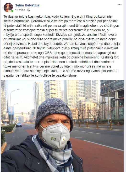 Këshilloj fort që, derisa situata te merret plotësisht nen kontroll, udhëtimet dhe kontaktet fizike me Kinën ti shtyni për më vonë! Ju lutem informohuni sa më mirë e binduni vetë para se ti hyni nje situate me shume rrezik nga virusi por edhe të papritur per shkak te kontrolleve te pazakonshme”, thekson Belortaja.