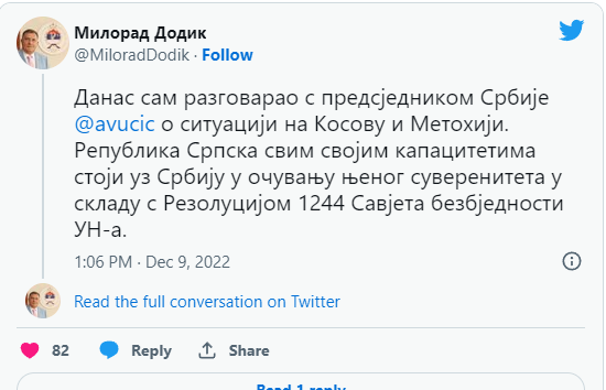 Ai shtoi se Republika Sërpska me të gjitha kapacitetet e saj qëndron pranë Serbisë në ruajtjen e sovranitetit të saj në përputhje me Rezolutën 1244 të Këshillit të Sigurimit të OKB-së.