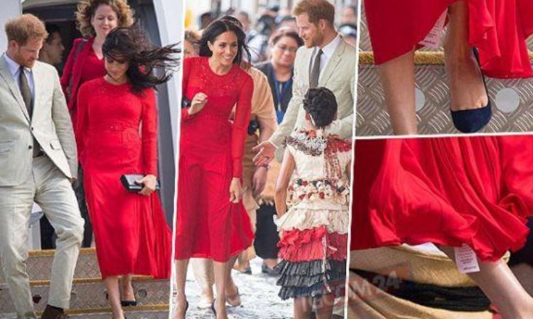 Teksa ka mbërritur në Tonga, ku vazhdojnë turneun e tyre zyrtar së bashku me bashkëshortin, Meghan ka zbritur nga avioni e veshur me një fustan të kuq me të qëndisura me lule, ku tregon format rrumbullake, por edhe etiketën e bardhë poshtë fustanit, të cilën era e ka ndihmuar ti dalë shpesh herë.