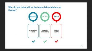 Ndërsa në pyetjen se ‘Kush mendoni që do të jetë Kryeministri i ardhshëm i Kosovës’, i pari është Avdullah Hoti me 40.4%, i dyti Ramush Haradinaj me 34.2% dhe i treti Albin Kurti me 25.4%./Arbresh.info