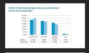 Në pyetjen drejtuar të anketuarve se “Cilin nga kandidatët për kryeministër e konsideroni si të ndershëm dhe të besueshëm?”, sipas këtij sondazhi del se Avdullah Hoti konsiderohet më i ndershmi dhe më besueshmi me 27.30% respektivisht 30.12%, i dyti është Albin Kurti me 25.30% dhe 24.10%, ndërsa i treti është Ramush Haradinaj me 21.90% dhe 19.10%.