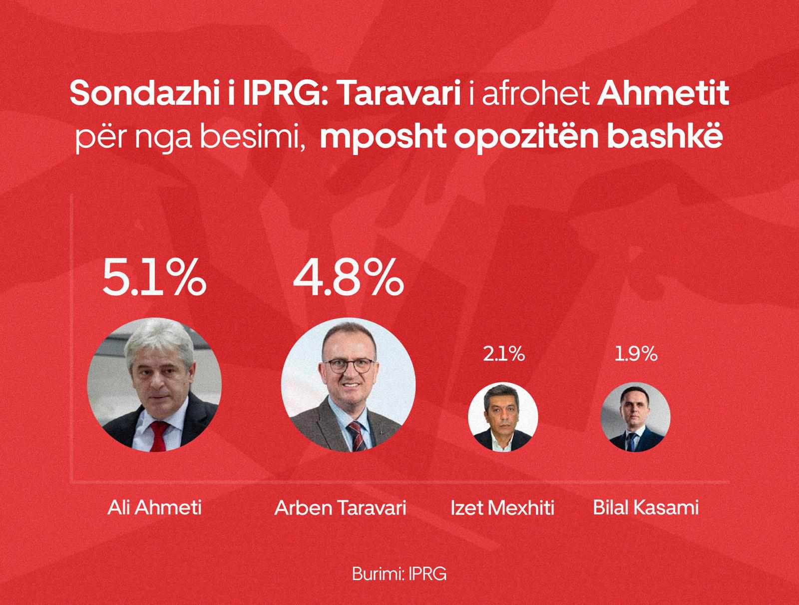 Sa i përket se cilit politikan i besoni më shumë, anketuesit në kampin shqiptar 5.1% votojnë për Ali Ahmetin dhe 4.8% votojnë për Arben Taravarin. Kasamit i besojnë vetëm 1.9%, Mexhtiti 2.1% ndërsa kryetarët tjerë të partive politike nuk figurojnë.