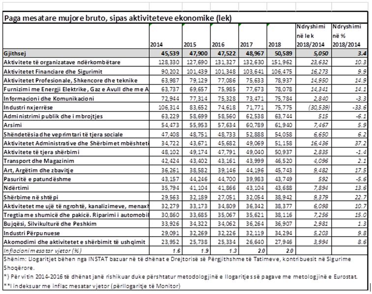 Paga mesatare në ekonomi në vitin 2018 ishte 50,6 mijë lekë, ose rreth 405 euro. Sipas tabelave të publikuara nga INSTAT, në krahasim me 2014, pagat janë rritur me 11%, ose rreth 5 mijë lekë, ose me 40 euro. Por e indeksuar me inflacionin mesatar vjetor, paga mesatare në ekonomi në krahasim me 4 vite më parë është rritur minimalisht vetëm me 3.4%.