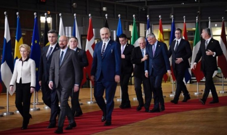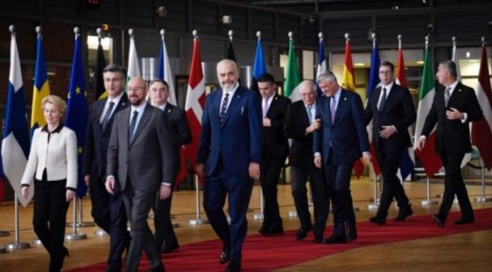 Në një nga fotot, të cilat janë publikuar nga media ndërkombëtare, shihen liderët e Ballkanit Perëndimor dhe ata të BE-së duke shkuar për të bërë një fotografi të përbashkët.