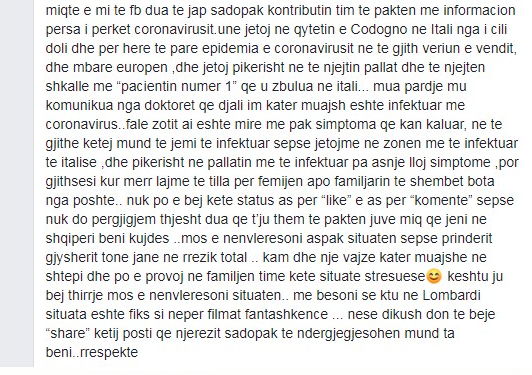 “Miqtë e mi të Facebook-ut dua të jap sadopak kontributin tim të paktë me informacion përsa i përket koronavirusit. Unë jetoj në qytetin e Codogno-s në Itali, nga i cili doli edhe për herë të parë epidemia e koronavirusit në të gjithë veriun e vendit dhe mbarë Evropën, dhe jetoj pikërisht në të njëjtin pallat dhe të njëjtën shkallë me pacientin numër 1 që u zbulua në Itali. Mua pardje m’u komunikua nga doktorët që djali im 4-muajsh është infektuar me koronavirus. Falë Zotit ai është mirë me pak simptoma që kanë kaluar, ne të gjithë këtj mund të jemi të infektuar, sepse jetojmë në zonën më të prekur të Italisë dhe pikërisht në pallatin më të infektuar pa asnjë lloj simptome por gjithsesi kur merr lajme të tilla për fëmijën apo familjarin të shembet bota nga poshtë. Nuk po e bëj këtë status as për like e as për komente, sepse nuk do përgjigjem, thjesht dua që t’ju them të paktën juve miq që jeni në Shqipëri që bëni kujdes, mos e nënvlerësoni aspak situatën sepse prindërit, gjyshërit tonë janë në rrezik total. Kam dhe një vajzë 4-muajshe në shtëpi dhe po e provoj në familjen time këtë situatë stresuese. Kështu ju bëj thirrje mos e nënvlerësoni situatën. Nëse dikush do të bëjë share këtij posti që njerëzit sadopak të ndërgjegjësohen mund ta bëni”, shkruan emigranti.